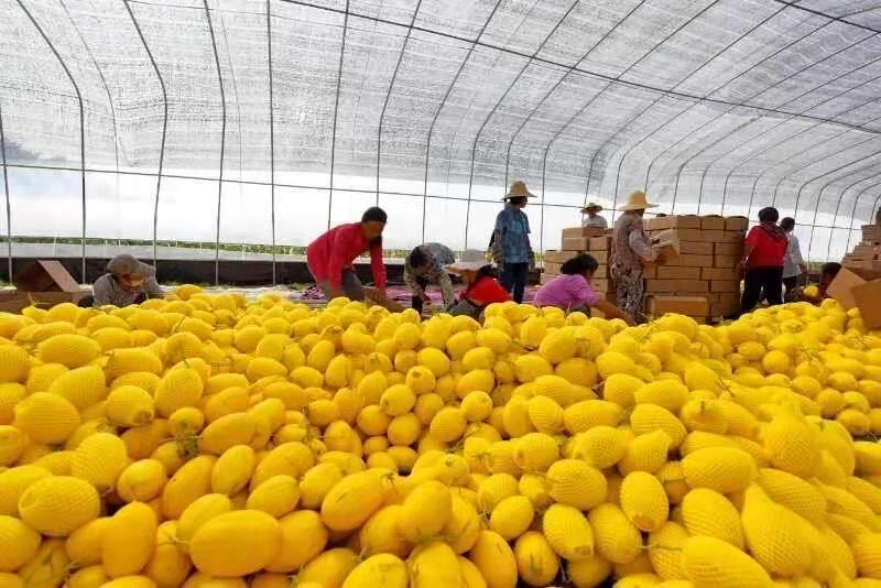 針對扶貧村土地及氣候特性,公司對當地種植品種及種植技術進行優化調整,以種植生產黃金蜜瓜(上茬)+豆丹養殖(下茬)+豆角種植為主產業,試作蒜苗+菠菜間套作復種模式。其中黃金蜜瓜平均畝產5000斤以上,豆角平均畝產4000斤以上,豆丹平均畝產達180斤以上。在黃金蜜瓜種植期間首次采取單株雙果,蜜蜂試驗授粉種植管理模式,實現了全程綠色種植,甜瓜長勢茂盛,個頭碩大,均能達到單頭3斤以上,彌補了全國6-7月份黃金瓜市場品種空白,創造了較好的經濟及社會價值。