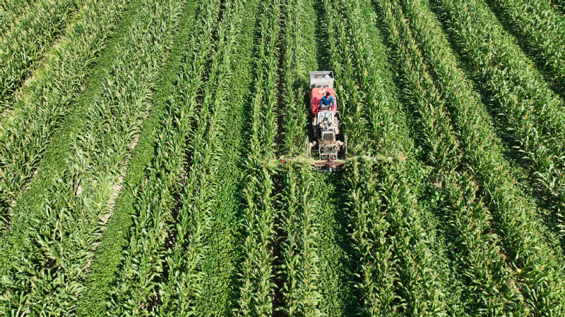蘇墾農發抓好12萬畝玉米大豆帶狀復合種植精細化管理,在去年成功試驗的基礎上,組織農機對玉米進行去頂,既降低植株高度,減少倒伏風險,又增加了玉米大豆受光面積,促進產量提高。圖為農機在蘇墾農發東辛分公司玉米大豆田間進行玉米去頂作業。