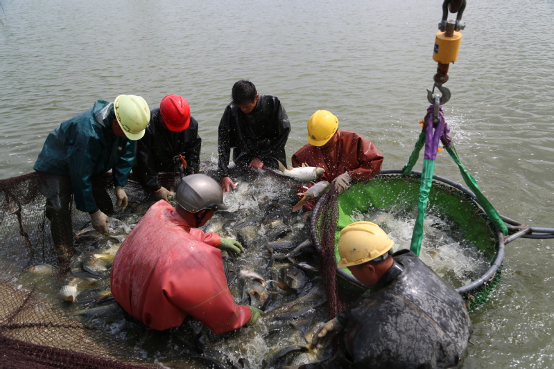 初秋的早晨已然涼意十足,早上不到6點,天剛蒙蒙亮,捕撈人員就來到魚塘開網(wǎng)起魚。在水產公司工作人員的指揮下,一張巨大的漁網(wǎng)隨著捕魚工人的移動緩緩張開,大家不顧冰冷的水下溫度,緊張忙碌了起來。經過鋪底、收網(wǎng)、聚攏等環(huán)節(jié)的共同協(xié)作,漁網(wǎng)被慢慢升起……整個現(xiàn)場一片繁忙熱鬧景象。經過近三個小時的忙碌,在大家的精心分揀下,裝滿魚的筐子被吊車有序吊起,稱重、記錄、放魚一氣呵成。“這個吊車頂部的黃色圓塊就是電子秤,吊起魚的同時,秤上的信號就發(fā)到這個無線接收裝置上來,秤重既方便又精準?!爆F(xiàn)場記賬的方正解釋說。