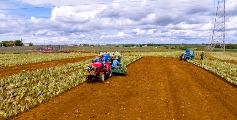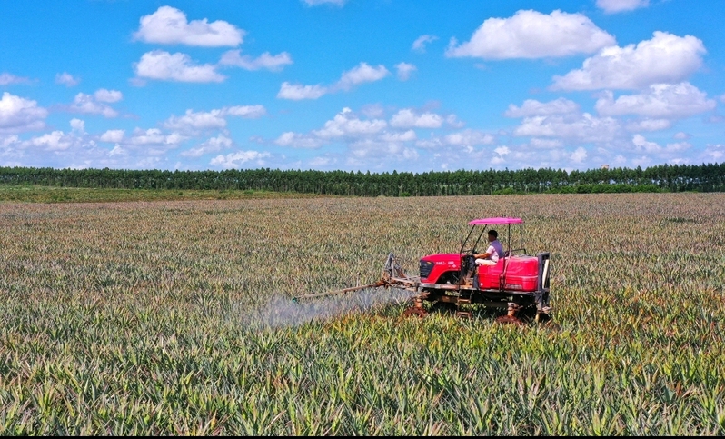 友好農(nóng)場(chǎng)的萬(wàn)畝菠蘿田處于菠蘿生長(zhǎng)黃金地帶,早期主要種植巴厘品種,占總面積的98%以上。由于種植存在品種單一、管理粗放、單價(jià)低等問(wèn)題,一度出現(xiàn)“農(nóng)戶(hù)不敢種,商人不敢收”的窘境。2021年以來(lái),友好農(nóng)場(chǎng)利用菠蘿產(chǎn)業(yè)強(qiáng)鎮(zhèn)項(xiàng)目,引進(jìn)臺(tái)農(nóng)16號(hào)、17號(hào)等優(yōu)質(zhì)鳳梨品種,篩選出果肉嫩滑、酸甜適中的臺(tái)農(nóng)17號(hào)等優(yōu)良品種,試驗(yàn)示范種植480畝,并通過(guò)GPS定位、蓋膜、電石催花、果實(shí)套袋等技術(shù)創(chuàng)新,努力攻克鳳梨管理技術(shù)難題,實(shí)現(xiàn)了畝均利潤(rùn)近3000元,讓農(nóng)戶(hù)的“傷心果”變成了“致富果”。如今標(biāo)準(zhǔn)化種植模式已帶動(dòng)30戶(hù)農(nóng)戶(hù)種植臺(tái)農(nóng)17號(hào)、芒果鳳梨、冬蜜鳳梨等新品。農(nóng)場(chǎng)計(jì)劃3年內(nèi)實(shí)現(xiàn)1萬(wàn)畝新品種示范規(guī)模,覆蓋率達(dá)50%以上。