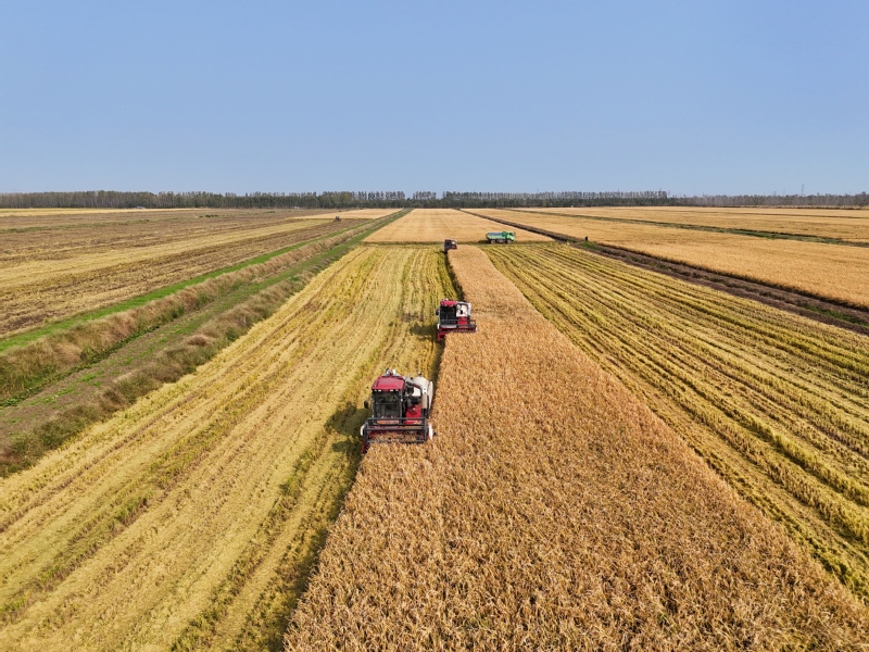 10月28日,江蘇省連云港市海州區的江蘇農墾崗埠農場,7臺收割機在農田里進行雜交水稻收割作業。連日來,崗埠農場5萬畝優質水稻陸續進入成熟收獲期,當地搶抓晴好有利天氣,積極組織農機、人員進行水稻收獲、晾曬及烘干工作,確保優質水稻顆粒歸倉。