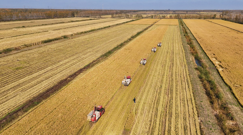 11月5日,連云港市海州區(qū),江蘇農(nóng)墾崗埠農(nóng)場(chǎng)的高標(biāo)準(zhǔn)農(nóng)田里,職工駕駛收割機(jī)來回穿梭,開展水稻搶收工作。連日來,當(dāng)?shù)胤e極組織人員、機(jī)械,搶抓農(nóng)時(shí)做好水稻收割工作,爭(zhēng)取盡快完成秋收,確保顆粒歸倉。徐衛(wèi) 方冉冉 攝
