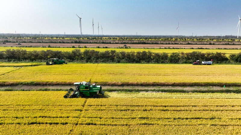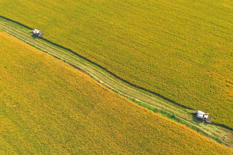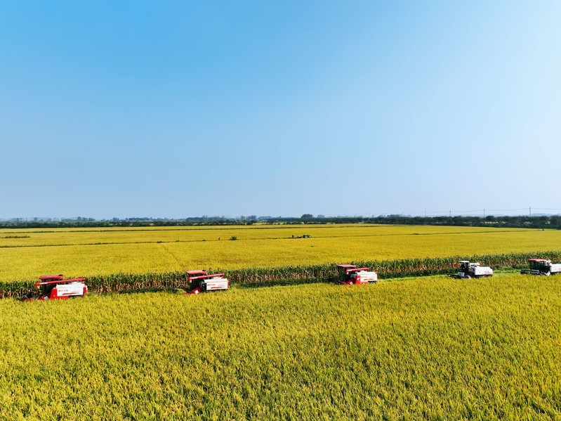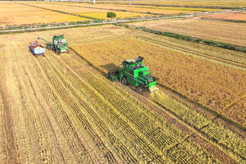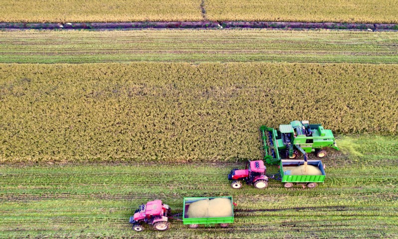 “開鐮了!豐收了!”10月17日上午10時,一臺臺聯(lián)合收割機(jī)駛向蘇墾農(nóng)發(fā)新洋分公司新北生產(chǎn)區(qū)5大隊,金黃的水稻被大型機(jī)械收入“囊”中,新洋5.3萬畝水稻機(jī)收作業(yè)正式拉開序幕。今年“三秋”是集團(tuán)公司第二次黨代會勝利召開后的第一個農(nóng)忙,做好“三秋”工作意義重大,黨委班子成員靠前指揮,深入田間查看水稻收割情況。稻田接連成片,稻穗迎風(fēng)擺動,收割機(jī)馬力全開、縱橫馳騁,收割、脫粒、裝車……一氣呵成,一派豐收的喜人景象。收割現(xiàn)場,蘇墾農(nóng)發(fā)新洋分公司嚴(yán)格收割質(zhì)量監(jiān)督,把機(jī)械減損作為糧食增產(chǎn)的重點(diǎn),加大收割質(zhì)量檢查力度,減少收割損失,實現(xiàn)秋糧顆粒歸倉。“我們密切關(guān)注天氣情況和水稻成熟度,統(tǒng)籌安排,堅持質(zhì)量第一,進(jìn)度第二,努力做到成熟一塊收割一塊,穩(wěn)步推進(jìn)收割進(jìn)度。”農(nóng)業(yè)中心負(fù)責(zé)人介紹。蘇墾農(nóng)發(fā)新洋分公司立足“前期‘揀’收、中期‘穩(wěn)’收、后期‘搶’收”的原則,充分利用秋收早期溫度高,有利晾曬、烘干的條件,適時收、曬、烘,為秋播及時騰茬,確保11月6日前完成秋播田塊收割任務(wù)。面對不穩(wěn)定天氣因素,蘇墾農(nóng)發(fā)新洋分公司強(qiáng)化機(jī)械保障,本部準(zhǔn)備收割機(jī)58臺套,運(yùn)糧車53臺,另調(diào)度好26臺小型履帶式收割機(jī),隨時應(yīng)對突發(fā)