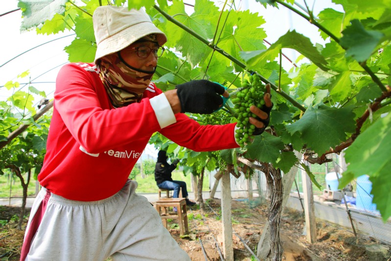 連日來,江心沙農(nóng)場果農(nóng)在葡萄園忙著疏果作業(yè),根據(jù)坐果率高低剪掉病蟲果、裂果、日灼果、畸形果等,選留大小一致、向外排列整齊的果子,做到密度適中、串型合理,確保采摘時高產(chǎn)與優(yōu)質并舉。