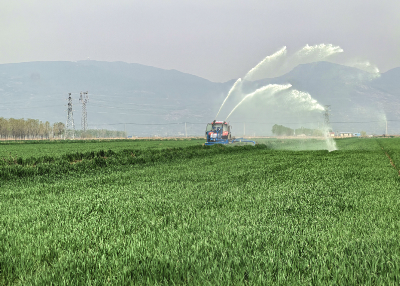 當前正值小麥拔節(jié)孕穗關鍵期,面對近期持續(xù)少雨天氣,蘇墾農(nóng)發(fā)東辛分公司搶抓農(nóng)時,組織農(nóng)業(yè)生產(chǎn)區(qū)積極做好抗旱保苗等工作。小麥田里,一臺臺拖拉機搭載著專業(yè)灌溉設備,結合苗情、墑情分片分區(qū)科學澆水,水流均勻地灑落在嫩綠的麥苗間,一道道弧形水幕精準覆蓋農(nóng)田。