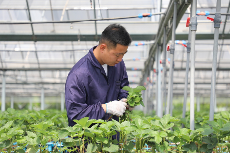 當前正值草莓苗生長的關鍵期,在三河農(nóng)場科技園區(qū)草莓高架大棚內,工作人員正在打草莓老葉并檢查草莓苗的生長情況,以便及時預防赤霉病、炭疽病等各種病蟲害。